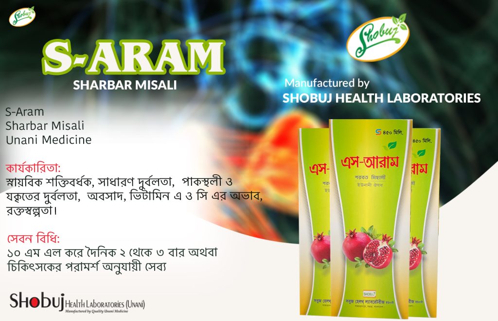 S-Aram সংক্ষিপ্ত বিবরণ: কার্যকারিতা: স্নায়বিক শক্তিবর্ধক, সাধারণ দুর্বলতা, পাকস্থলী ও যকৃতের দুর্বলতা, অবসাদ, ভিটামিন এ ও সি এর অভাব, রক্তস্বল্পতা। সেবন বিধি: ১০ এম এল করে দৈনিক ২ থেকে ৩ বার অথবা চিকিৎসকের পরামর্শ অনুযায়ী সেব্য